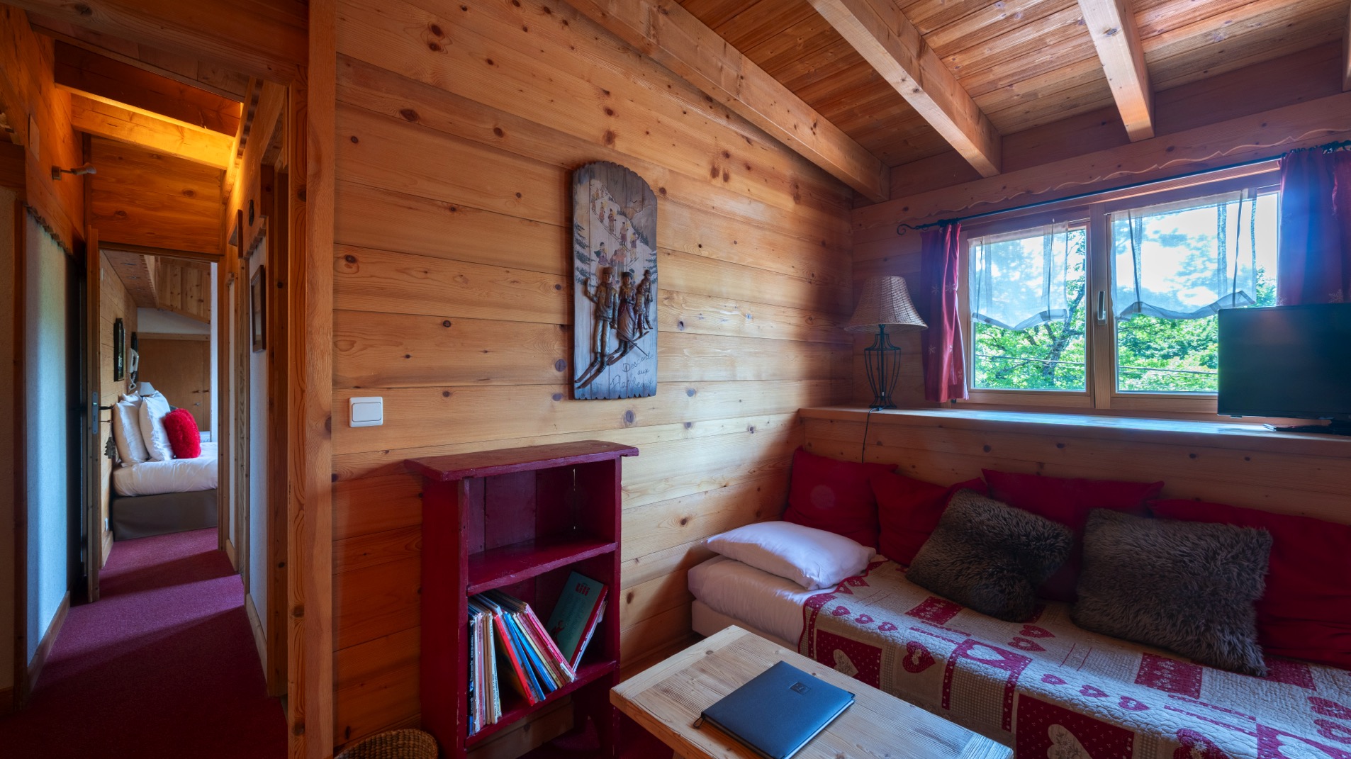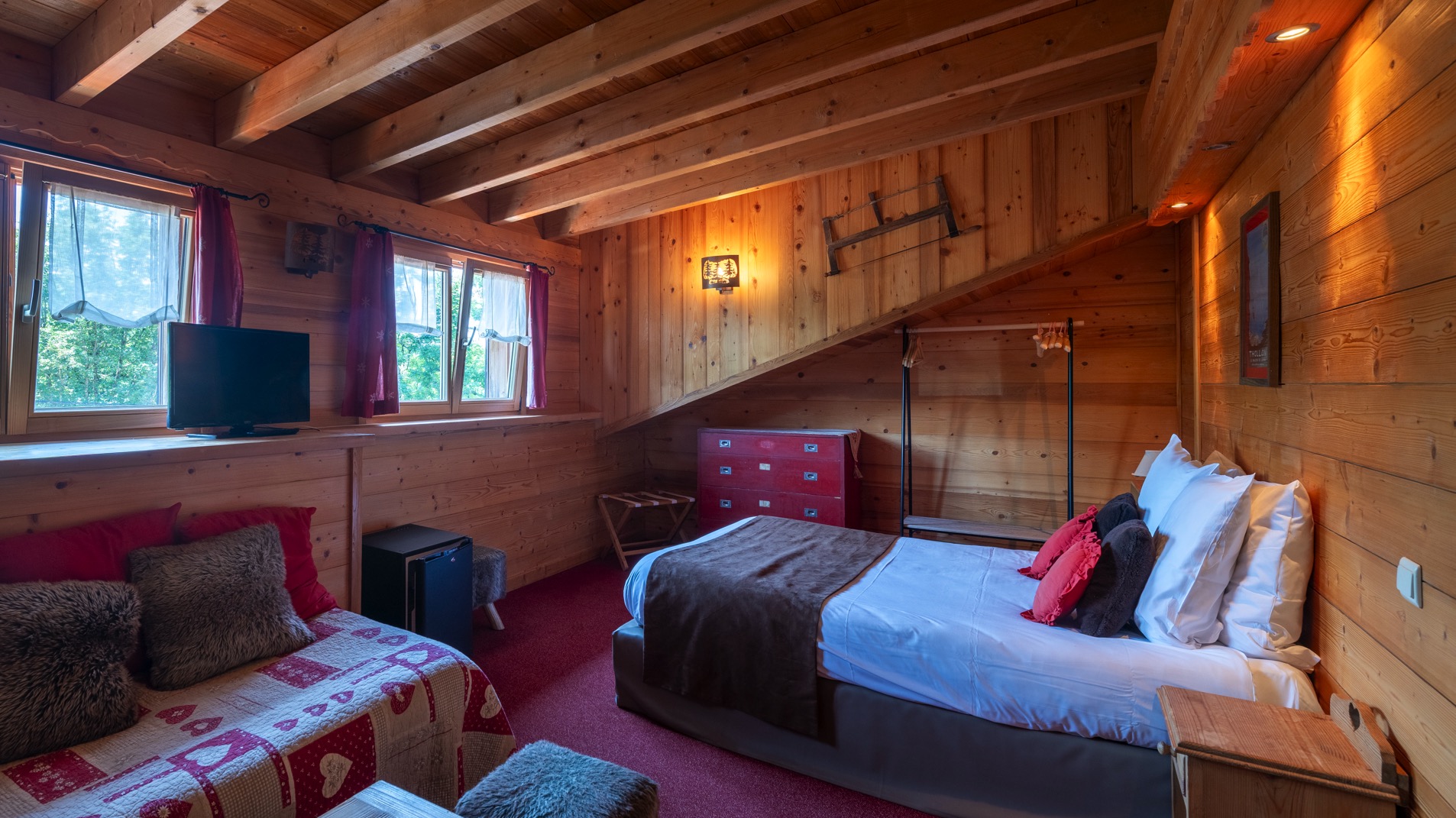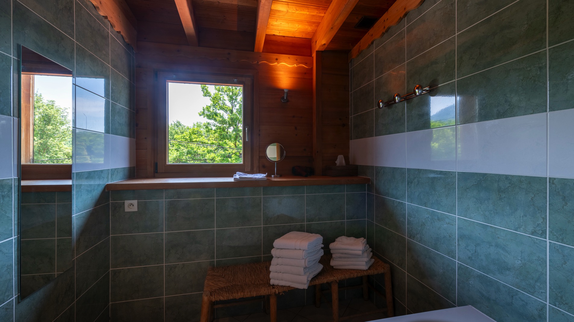 Les fenêtres offrent une vue apaisante sur le lac de la Beunaz et la forêt, créant une atmosphère naturelle et reposante au cœur de notre domaine.